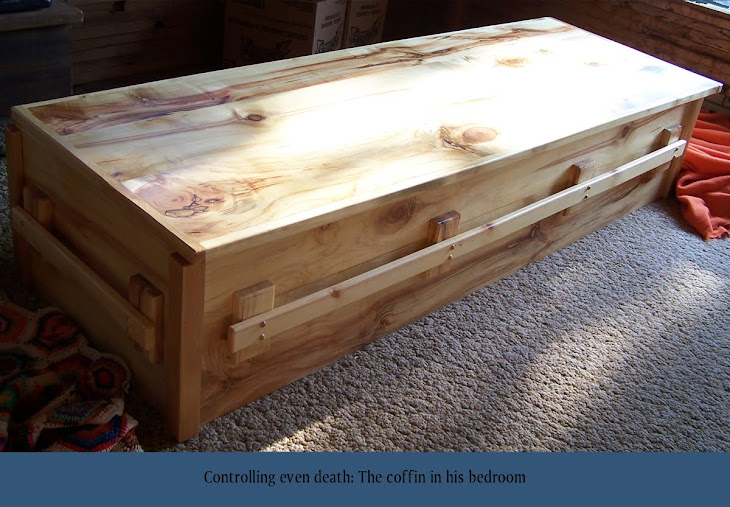 At the end of December, on my oldest son's birthday, my father-in-law finally died. He was 94 years old. Sister Caretaker wanted to cremate him because she was worn out and didn't want to deal with it anymore, but Sister Twin came and put him in his home-made coffin in the back of a pickup, drove him to Salt Lake City cemetery, and had him buried with my mother-in-law.